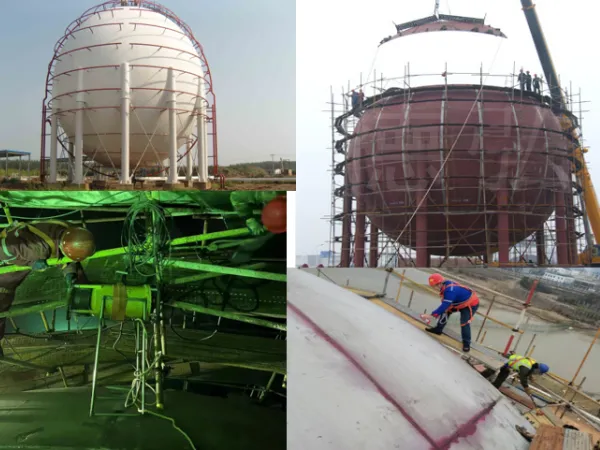2000m³双壳球储罐 江西省九江市中科鑫星新材料有限公司二期,为1台2000m³双壳球储罐内罐焊缝100%的RT检测,对接焊缝内、外表面及热影响区100%的PT检测,所有管道对接焊缝100%RT和100%PT检测,内罐耐压试验后所有的对接焊缝内、外表面及热影响区100%PT检测(包括工厂制造期间焊接的所有焊缝),所有工卡具及补焊位置打磨后的100%PT检测,梯子平台与外罐连接部位的100%PT检测,支柱与外罐赤道板的角焊缝100%PT检测,及现场需要检测的其它部位。